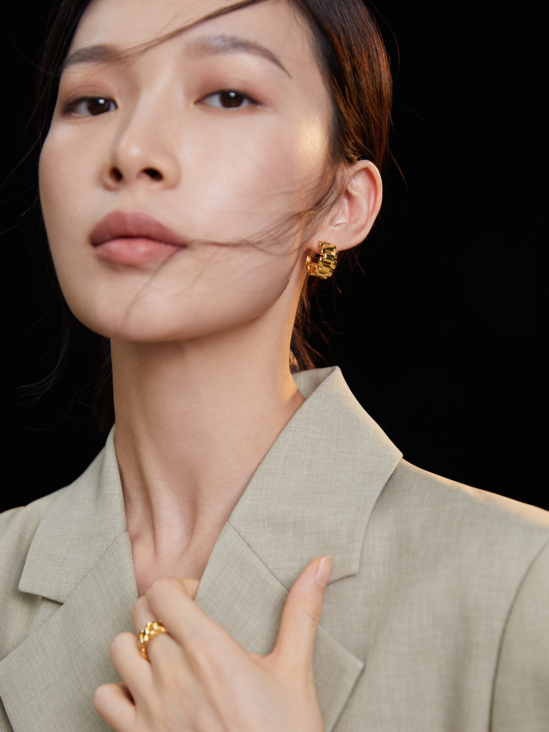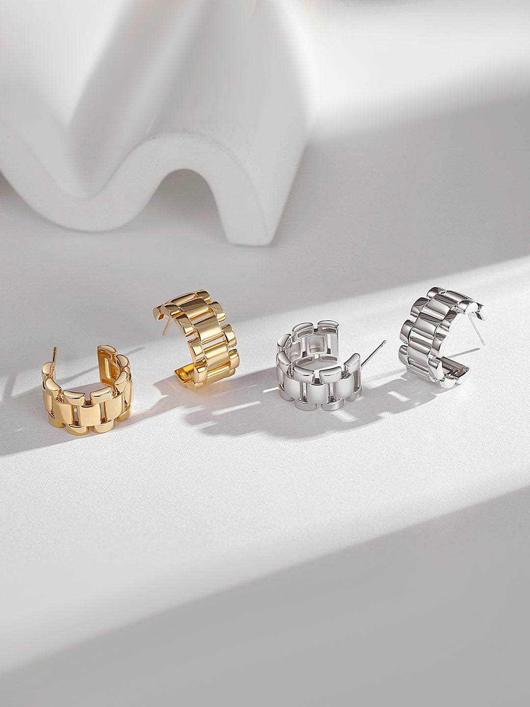 - Description:Featuring a bold yet refined link chain design, these hoops embody minimalism with an edge. Their clean lines and geometric silhouette make them a versatile statement piece, perfect for elevating both casual and formal looks.